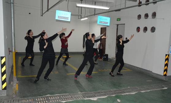 鼎盛國際員工在地下車庫認(rèn)真排練店慶節(jié)目