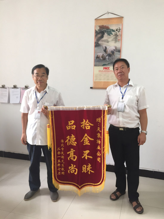 次日,向管理處送來(lái)鮮紅的錦旗一面,上書(shū):拾金不昧,品德高尚!