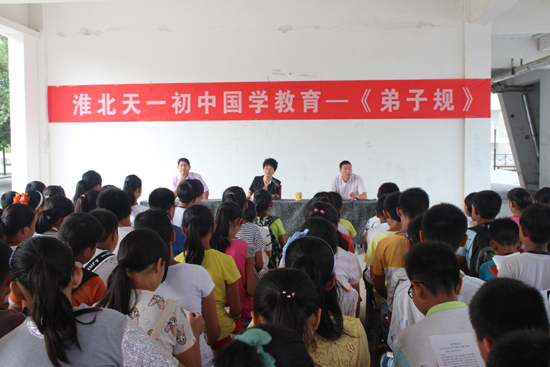 天一初中負(fù)責(zé)人郭光梅給學(xué)生講授《弟子規(guī)》,對學(xué)生文明禮儀、傳統(tǒng)美德、行為習(xí)慣、校規(guī)校紀(jì)進行了品德教育。天一初中一直把傳統(tǒng)教育和新形勢下教育理念相結(jié)合,在七年級新生即將進入中學(xué)階段學(xué)習(xí)之際,天一初中狠抓國學(xué)教育不放松,打好學(xué)生良好美德底色?;幢笔刑煲怀踔惺腔幢笔行⑽幕芯繒嶒灮?,一直以來,該校將對師生進行的《弟子規(guī)》《新24孝》教育與創(chuàng)建文明校園、精致校園緊密結(jié)合,取得了顯著成效。該校大力開展孝文化國學(xué)教育主題教育宣傳實踐活動,營造濃厚的孝老愛親文化氛圍。在校領(lǐng)導(dǎo)班子中,把孝老愛老作為加強自身建設(shè)的重要內(nèi)容和行為準(zhǔn)則,要做孝老愛親的模范;在教職工中,除做到為人表率外,要做到每月看望一次老人,每半年給雙方老人添衣物、鞋襪等,半年陪老人做一次體檢,一年給老人安排一次旅游;在學(xué)生中開展孝文化教育實踐活動,要求學(xué)生經(jīng)常向父母和老人問好,每周做一次家務(wù),每學(xué)期給父母寫一封感恩的信,每半年和父母或老人讀一本孝老愛親的圖書,把父母的生日和老年節(jié)定為感恩節(jié),經(jīng)常做一些力所能及的家務(wù)和公益活動。同時,對學(xué)生進行老年人權(quán)益保障法普及、古今孝道事例宣講等形式多樣的孝文化教育,并廣泛動員全體師生做孝文化的踐行者、傳播者、志愿者。