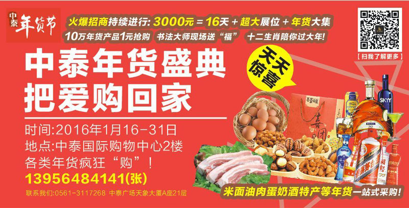 淮北中泰年貨節(jié)時(shí)間:2016年1月16日—31日,為期十六天。地點(diǎn):淮北中泰國(guó)際廣場(chǎng)(中泰淘寶街)。參展種類:特色農(nóng)產(chǎn)品及特色食品、糖酒/茶及飲料、民俗文化商品、服裝家紡、家電家居、汽車等。