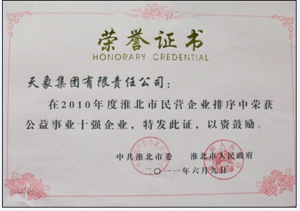 2010年度淮北市民營(yíng)企業(yè)益事業(yè)十強(qiáng)企業(yè)榮譽(yù)證書(shū)